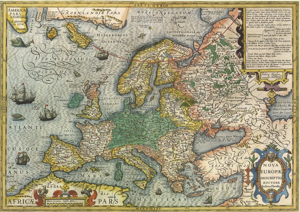 Europakarta i färg med gammaldags stil och med illustrationer av skepp och havsvarelser.