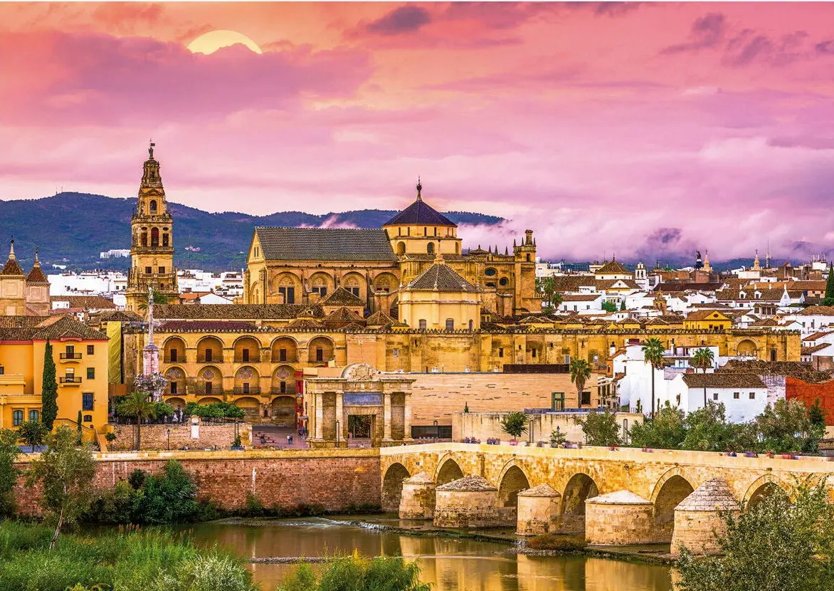 En vy över katedralen och för detta moskén Mezquita i staden Córdoba (Andalusien, södra Spanien). I motivet ser vi bron som leder upp mot byggnaden i sten, omgiven av stadens vitputsade hus och mot en slående vacker solnedgång i rosa och lila.