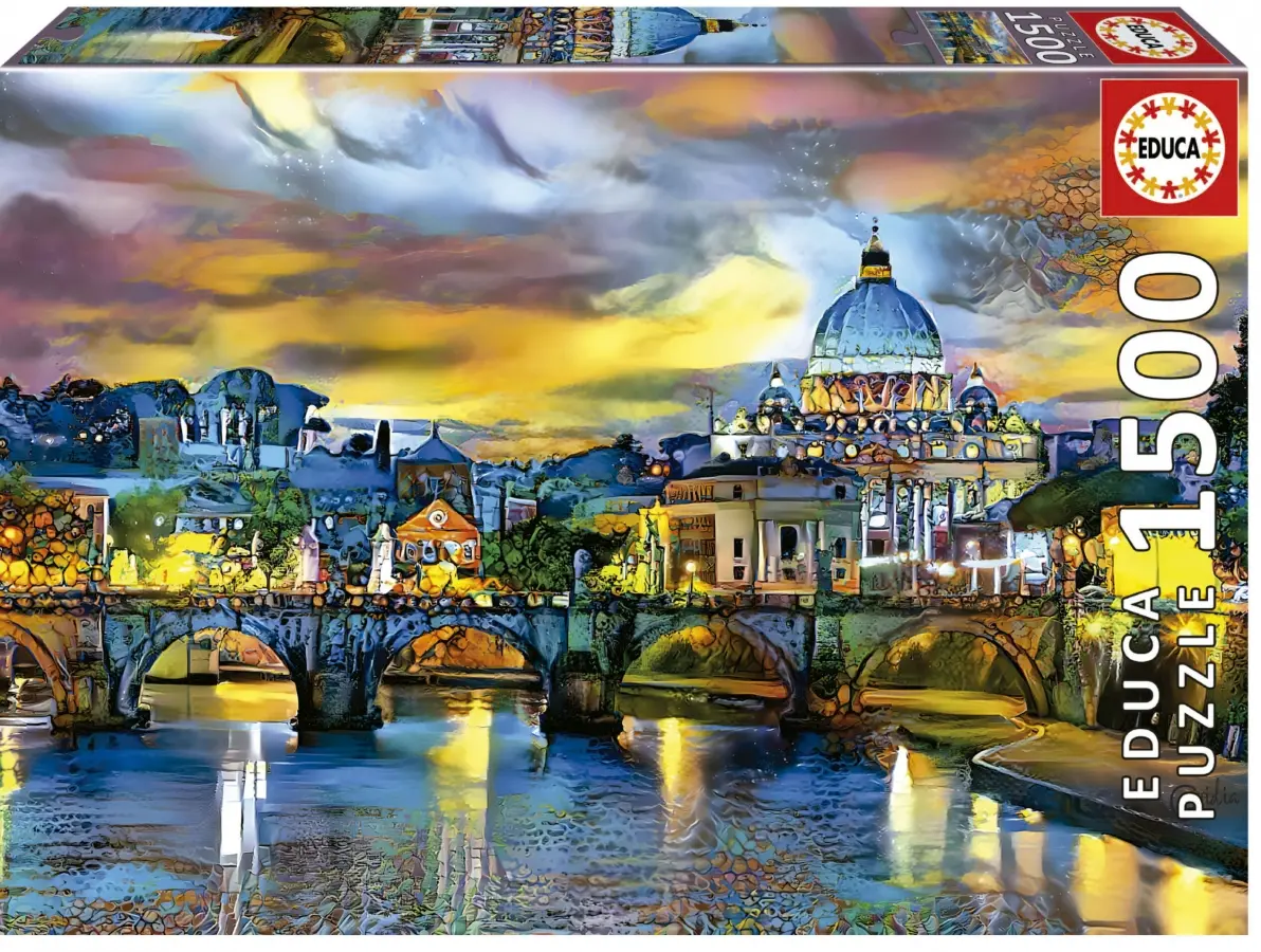 Motiv av Peterskyrkan och Ponte St. Angelo skapat av den digitala konstnären Pedro Gavidia. I motivet är det solnedgång och starka guldgula och blå toner är genomgående i pusselmotivet.