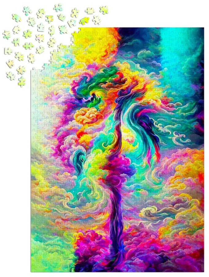 Något som liknar en lila pelare av rök stiger upp i ett böljande molntäcke, allt i regnbågens alla färger.