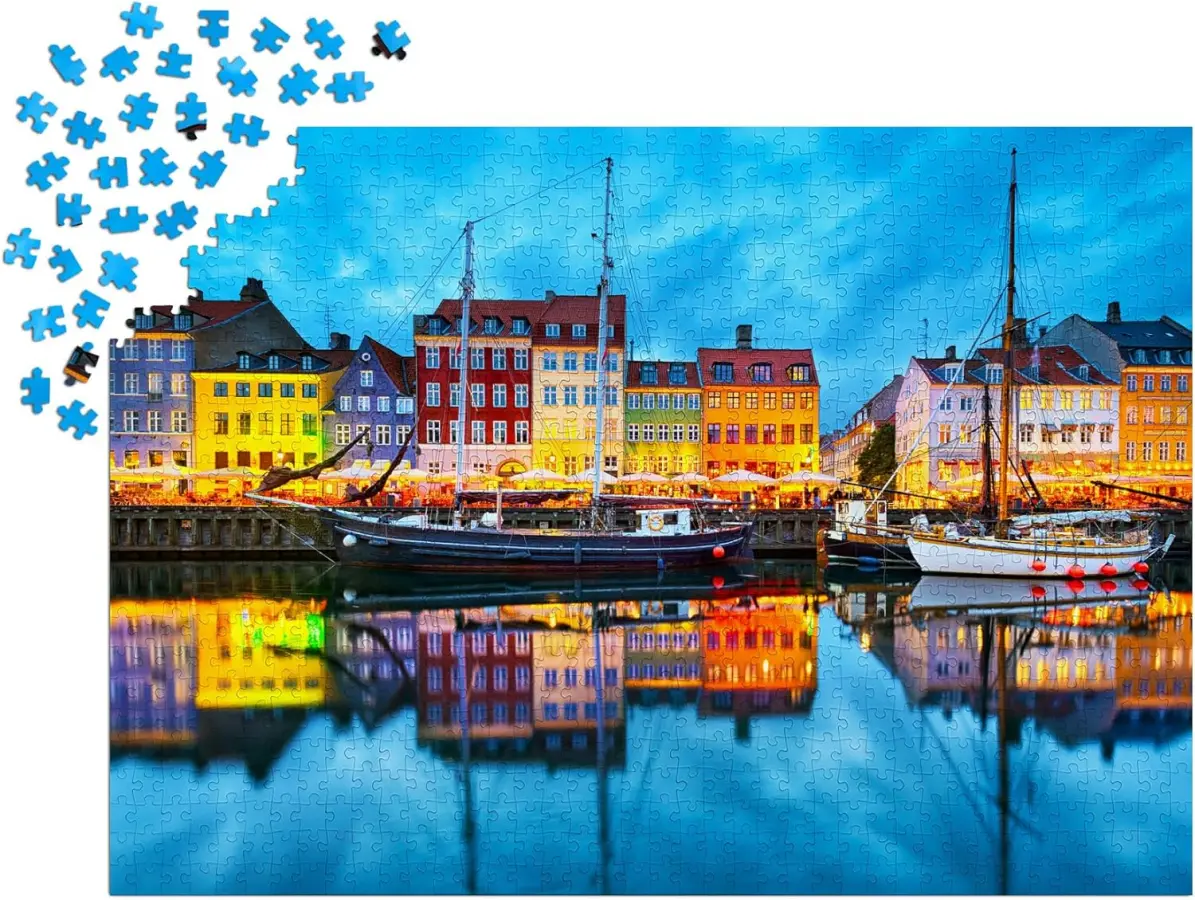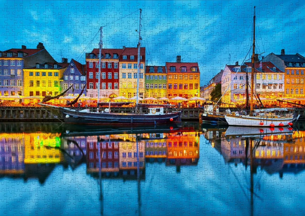 Motiv av färggranna byggnader längs "Nyhavn" i centrala Köpenhamn, Danmark. Det är kväll och de vackert upplysta byggnaderna speglar sig i vattnen, där båtar ligger förtöjda längs med kajen.