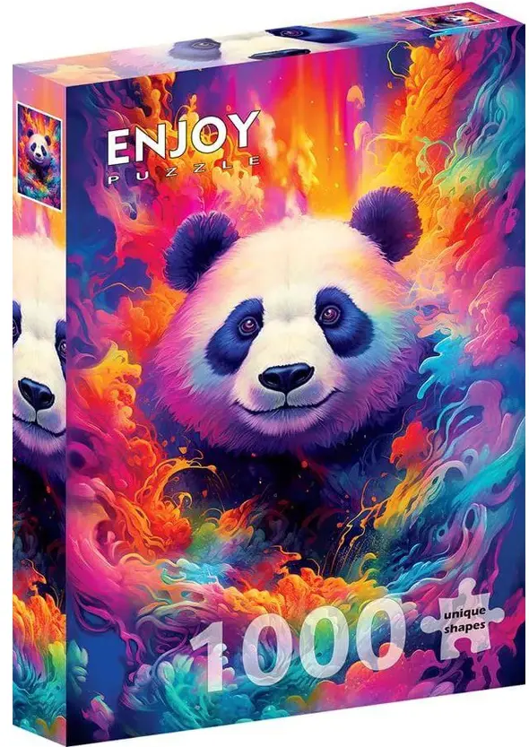 En panda sticker fram sitt huvud ur en kaskad av varma färger. Den riktar sin vänliga blick rakt mot pusslaren och man kan nästan skymta ett litet leende under den mjuka nosen.