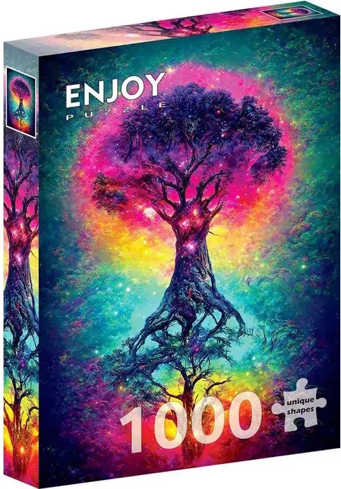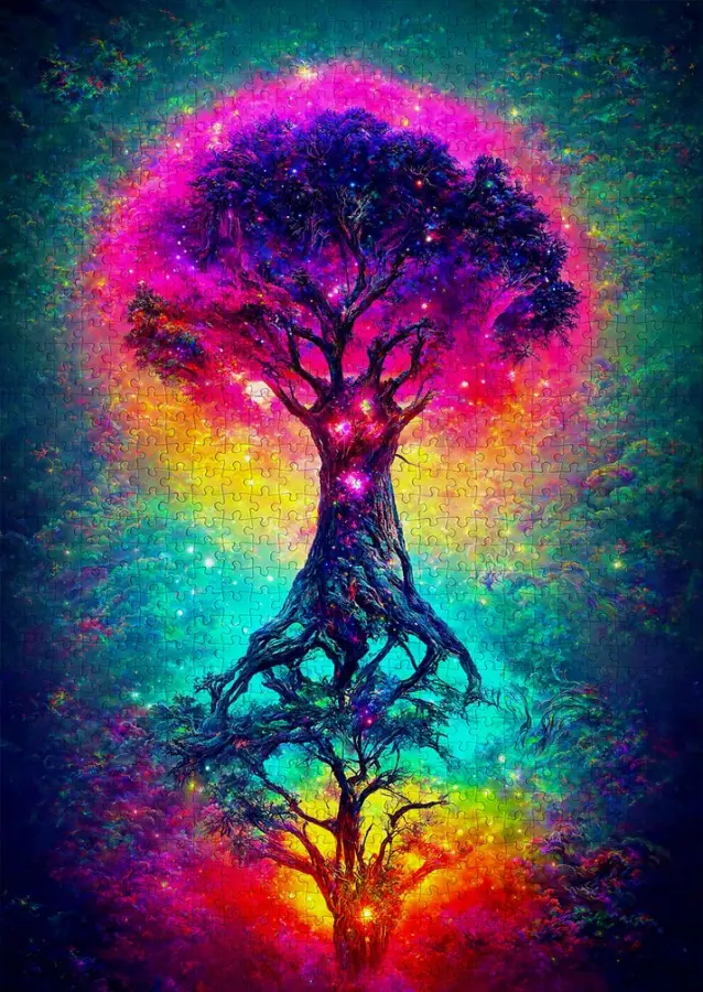 Universums mäktiga träd, omgivet av ett magiskt sken och tindrande ljus av energi.