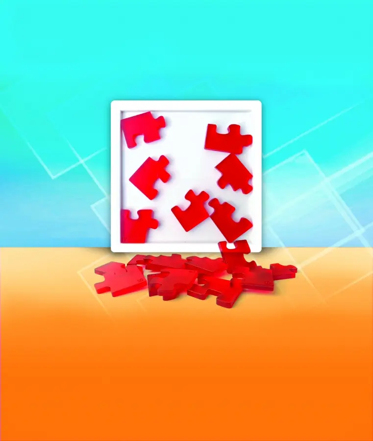 Pusselbitarna är genomskinligt röda. Storleksmässigt som en vanlig pusselbit men lite tjockare. Man får med en vit platta med ram som pusslet ska få plats i. Kan du lösa pusslet?