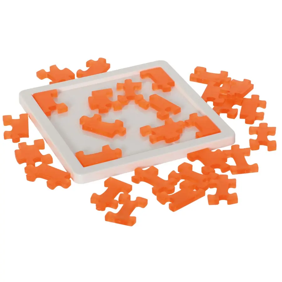 Pusselbitarna är genomskinligt orange-röda. Storleksmässigt som en vanlig pusselbit men lite tjockare. Man får med en vit platta med ram som pusslet ska få plats i. Kan du lösa pusslet?