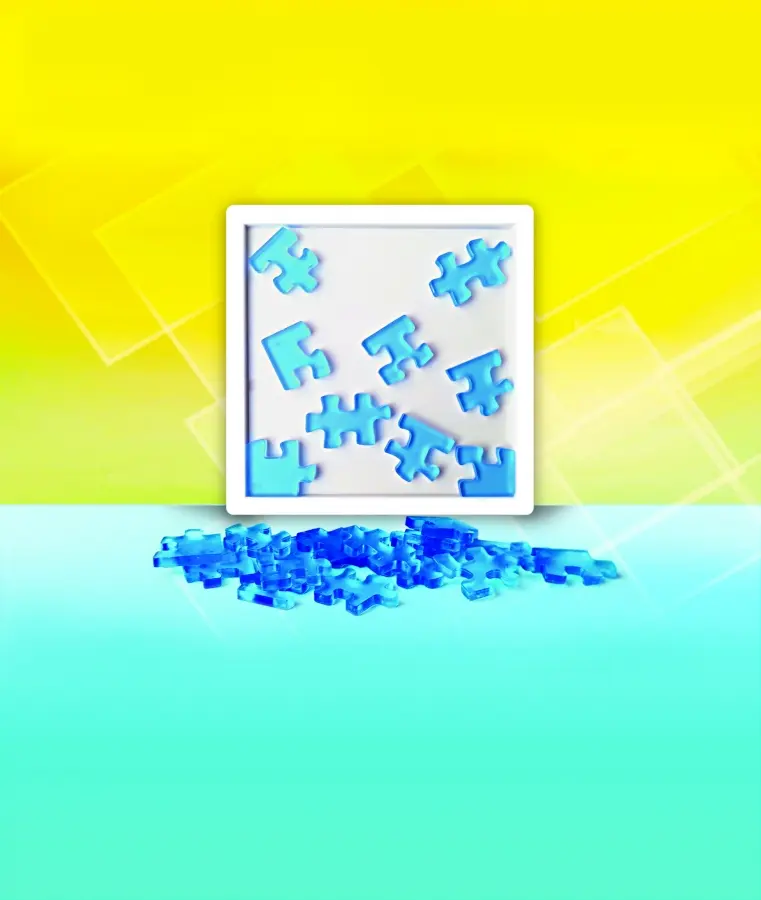 Pusselbitarna är genomskinligt blåa. Storleksmässigt som en vanlig pusselbit men lite tjockare. Man får med en vit platta med ram som pusslet ska få plats i. Kan du lösa pusslet? Lycka till!