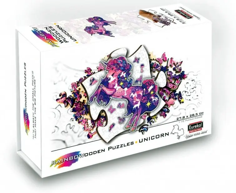 Träpussel med formen av en stegrande enhörning. Enhörningen skimrar i rosa, lila och blå toner och här och var gnistrar små stjärnor i gult.