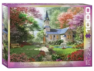 En liten kyrka i sten ligger vackert belägen med en blomstrande trädgård med en porlande fontän. Här står träden i blom och färgerna går i grönt, rosa och lila. Solen strålar mot kyrkan och lyser upp den lilla stengången som leder oss mot dess port.