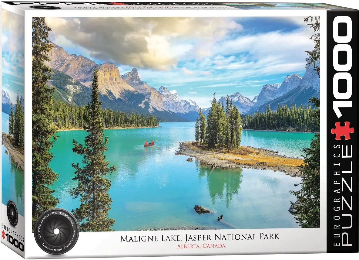 Vy över Maligne Lake i Kanada. Sjön ligger spegelblank, omgiven av barrskog och i bakgrunden tornar bergstoppar mot himlen. Ett par har givit sig ut på en kajaktur och de är helt ensamma i det vackra landskapet. Sjön ligger i provinsen Alberta, i den centrala delen av landet, 3 100 km väster om huvudstaden Ottawa.