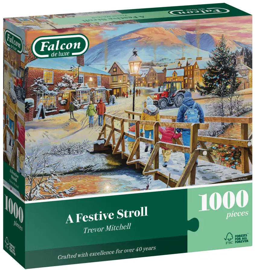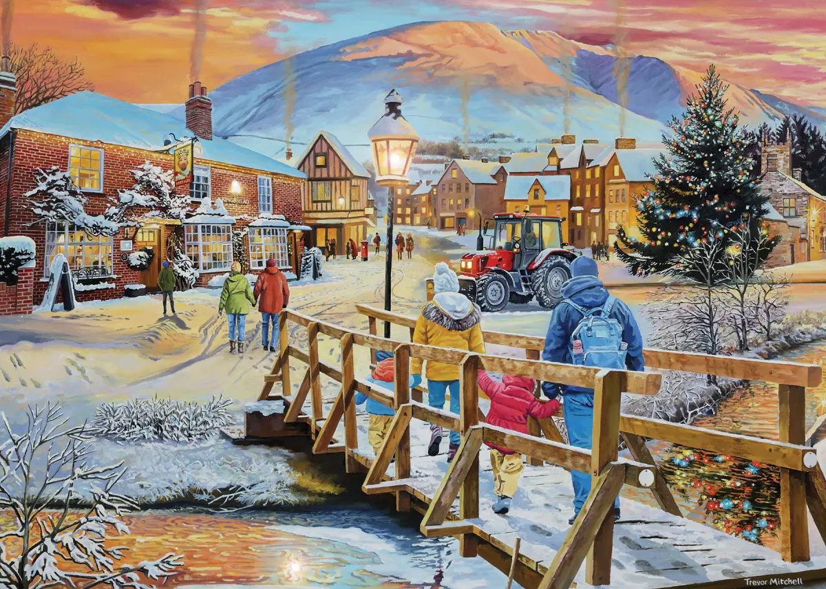 Solen har precis gått ner över en pittoresk liten stad i snöskrud, och på ett torg lyser en Julgran med sitt glada sken. Det ryker ur husens skorstenar och fönstren lyser med varmt och inbjudande sken. Några invånare är ute på en härlig promenad, en familj går över en älv på en enkel bor av trä, och i bakgrunden tornar snöbeklädda bergstoppar upp sig mot en skär himmel.