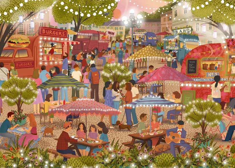 Ett livligt pusselmotiv utan att vara överväldigande, och som garanterar att du kommer att le och kanske bli lite hungrig medan du pusslar. Konstnären heter Jane Newland, en illustratör från Norwich, Norfolk, Storbritannien.