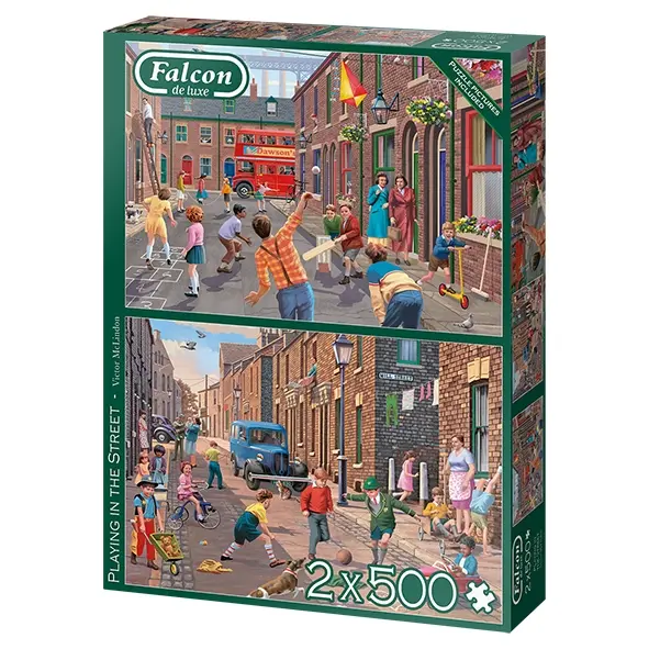 Två pussel med nostalgiskt motiv av barn som är ute och leker på gatan. Pusslen är på 500 bitar vardera och ligger separerade i var sin plastpåse i pusselkartongen.
