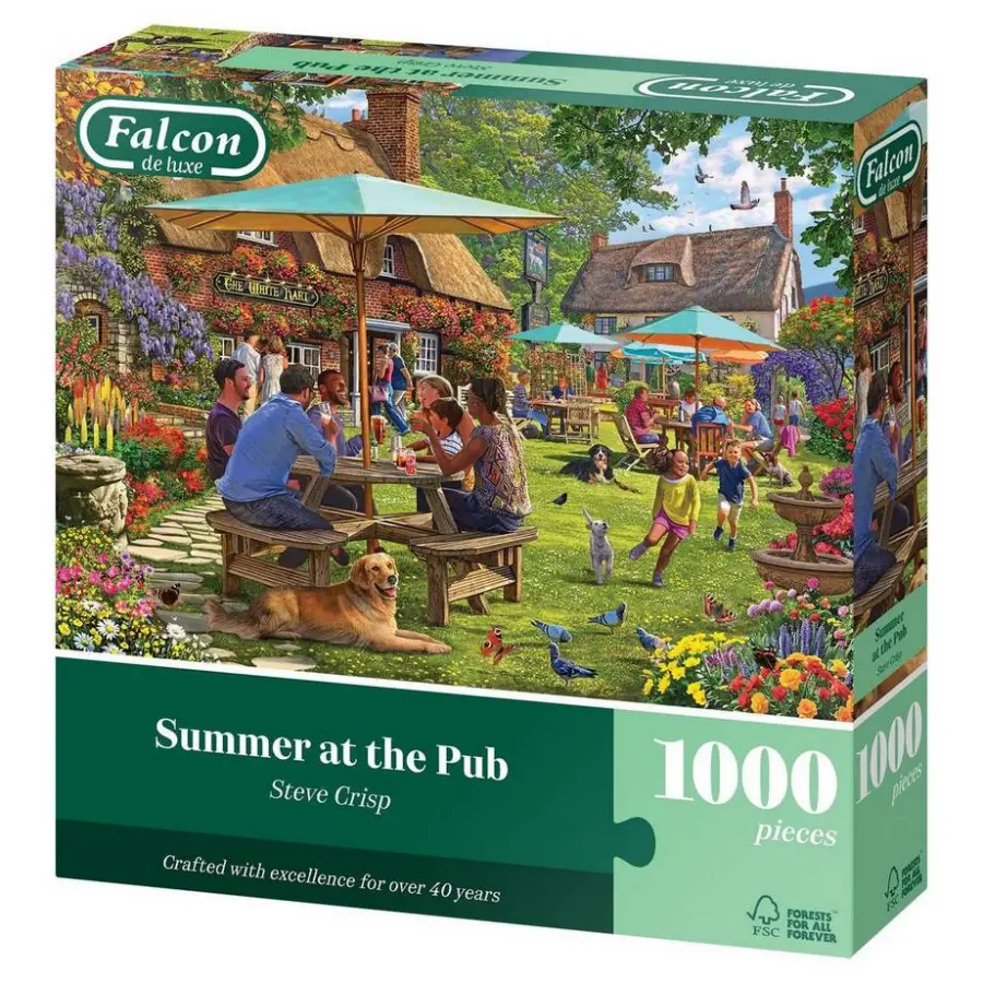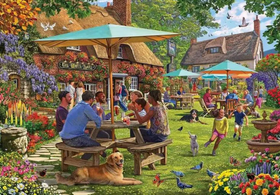Det är en varm sommardag på den brittiska landsbygden. Människor har samlats för en svalkande dryck och en god bit mat på den lokala pubbens uteservering. Här finns träbord att sitta vid och parasoll som ger välkommen skugga. Trädgården blommar, barnen leker på gräsmattan tillsammans med hundar, fjärilar och fåglar. Ett somrigt pusselmotiv med klara färger och mycket att titta på, skapat av pusselidyllernas mästare, konstnären Steve Crisp.