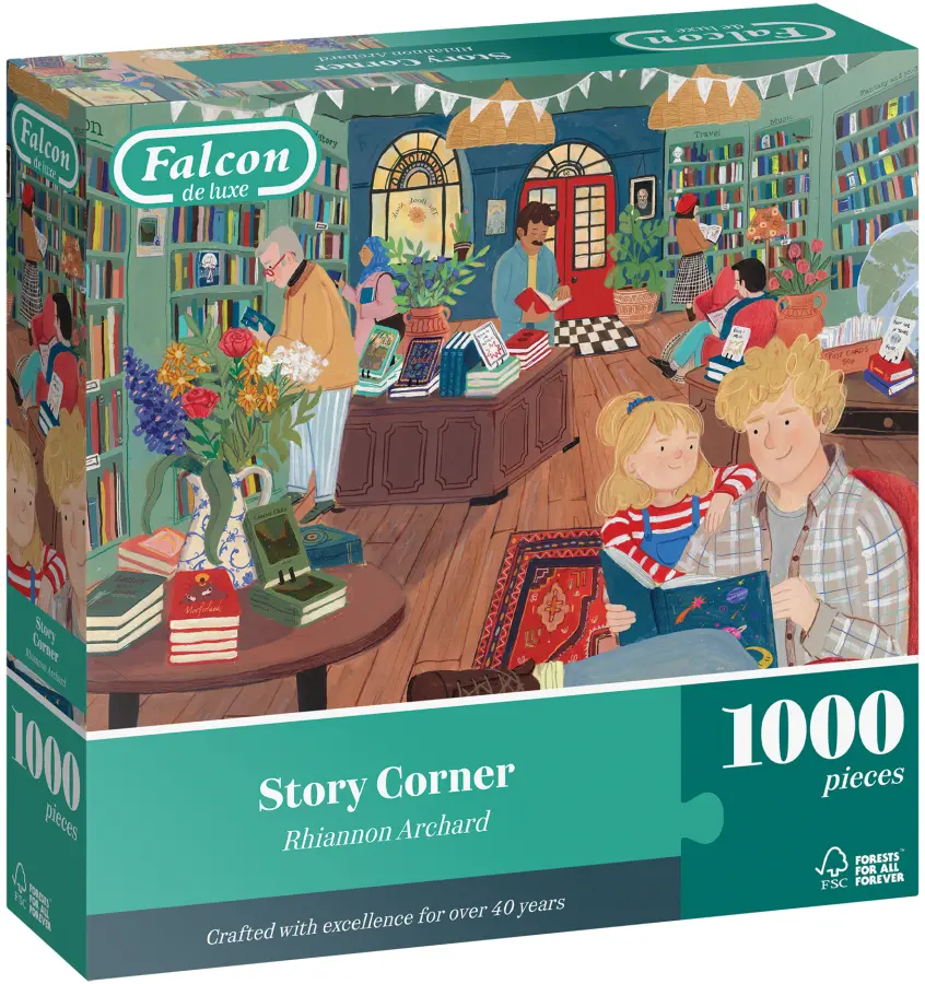 I det här pusselmotivet tar illustratören Rhiannon Archard med oss till en mysig bokhandel. Här finns fulla bokhyllor med färgglada bokryggar, bord där man lyft fram spännande boktitlar och rikligt med växter och blommor som skapar en välkomnande och lugn vardagsrumskänsla. Några besökare bläddrar i olika böcker och en man har slagit sig ner i en läshörna för att läsa för sin dotter.