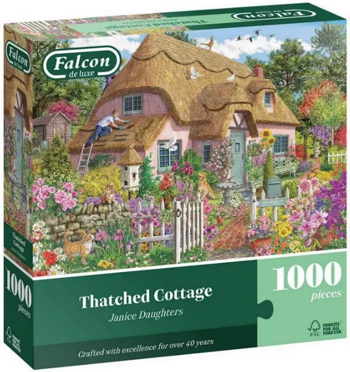 Två män håller på att reparera halmtaket på en vacker villa med rosa putsad fasad. Huset är omgivet av en fantastisk överdådig trädgård smockfull av blommor och liv. Här finns också en fontän, en fågelmatsstation, härliga blomsterportaler, stenlagda gångar, ett trädgårdsskjul och en vit bänk.
