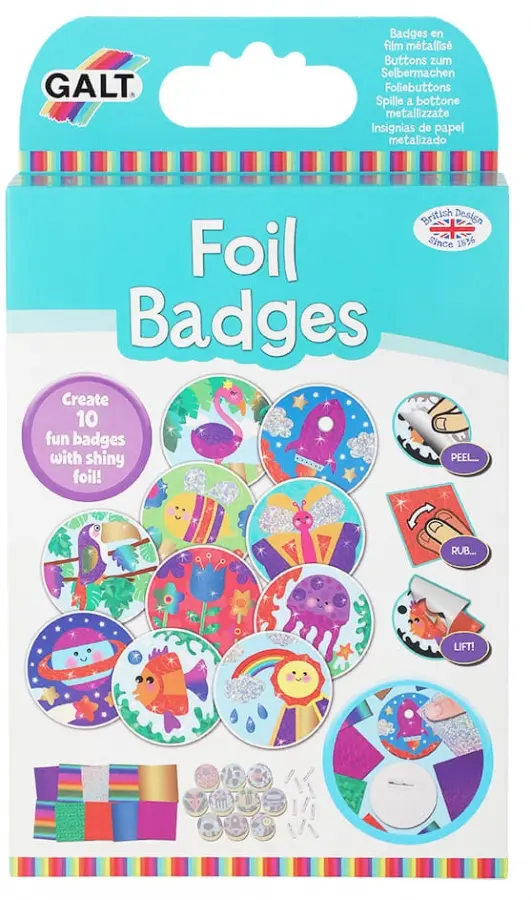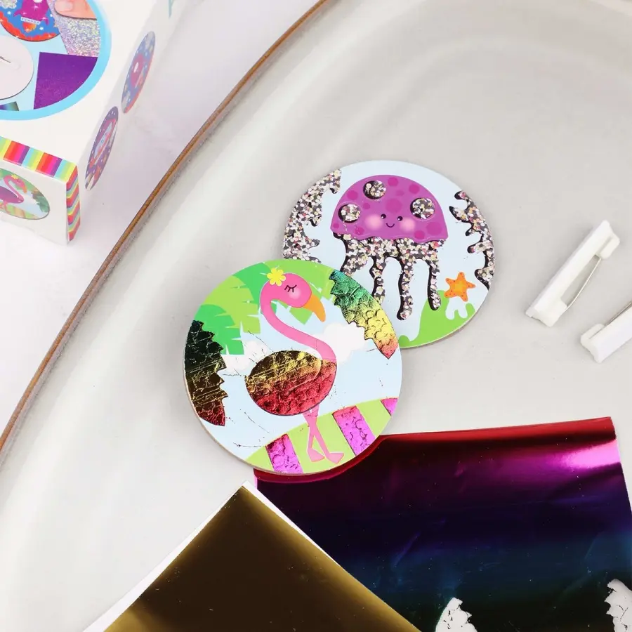 Innehåller: 10 folieark i blandade färger, 10 klistermärken, 10 underlag, 10 säkerhetsnålar och instruktioner.