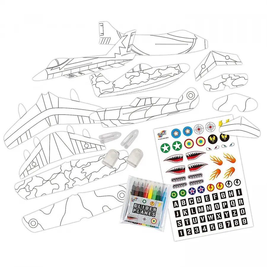 Innehåll: Formskurna delar till fyra glidflygplan, fyra nostyngder, 8 tuschpennor, klisterbilder och instruktioner.