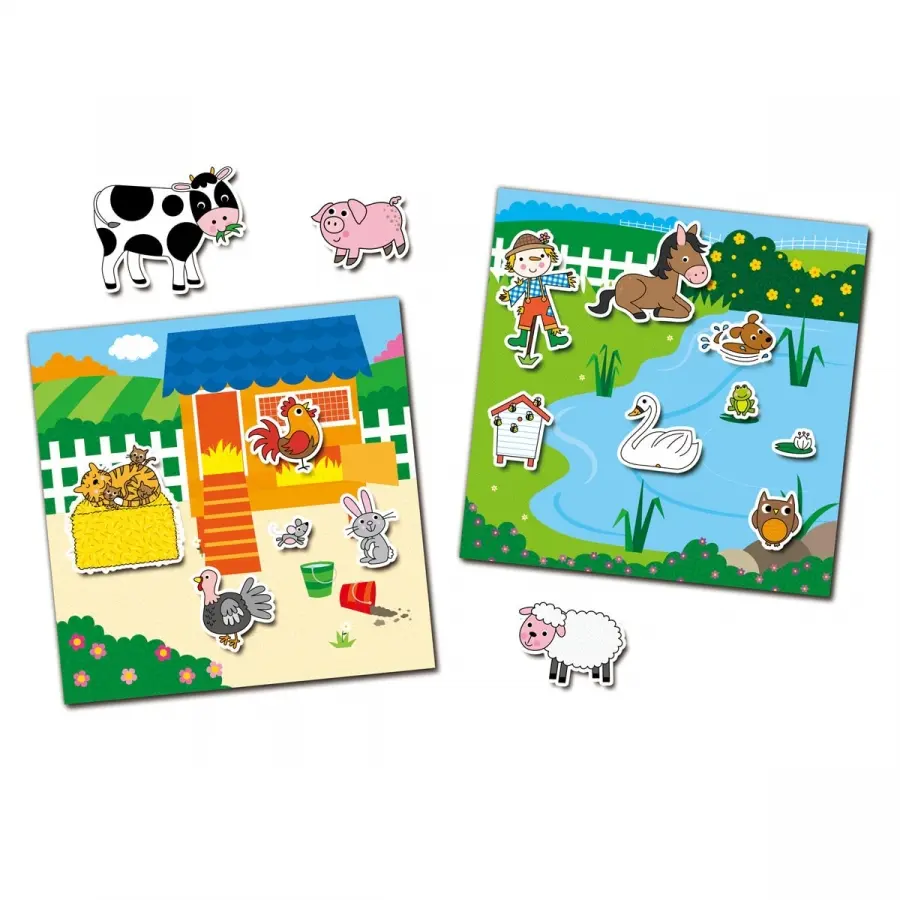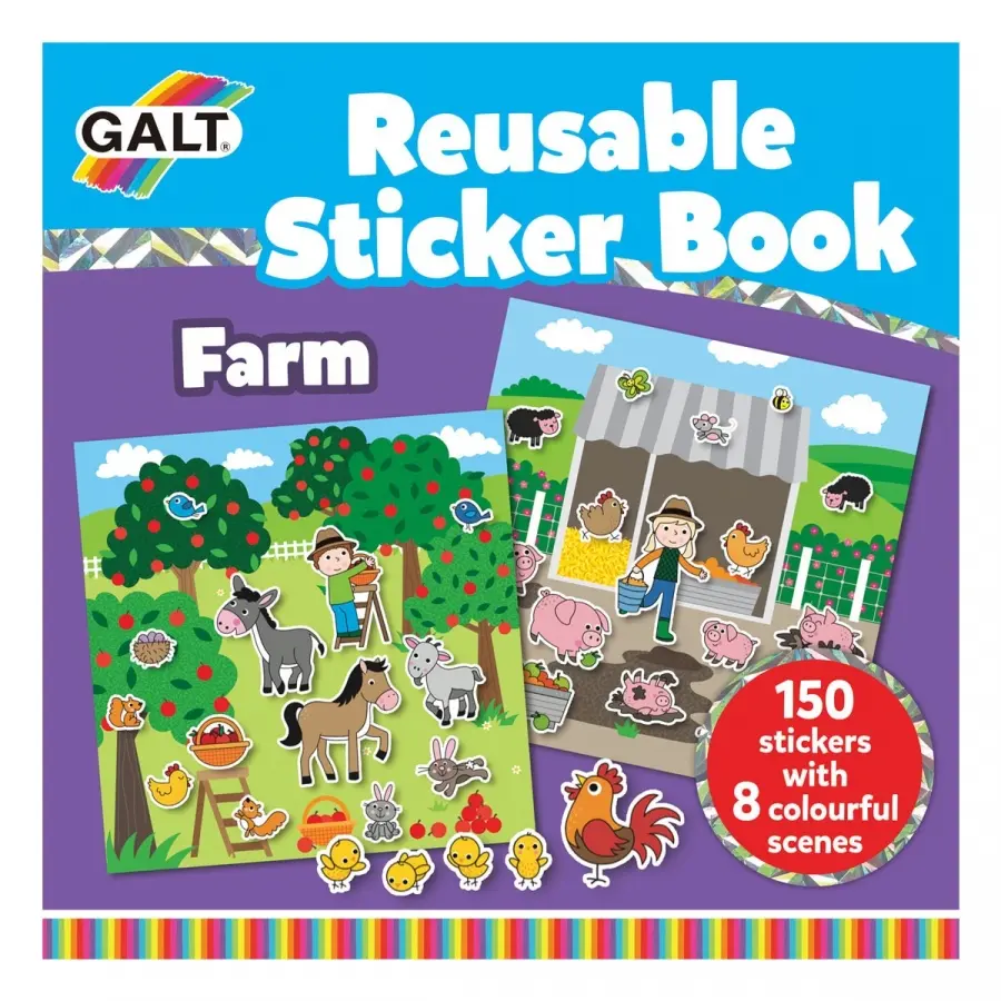 En stickerbok med lantgården som tema. I boken finns det åtta färgglada landskap och 150 klistermärken som man kan använda om och om igen. Perfekt på resan!