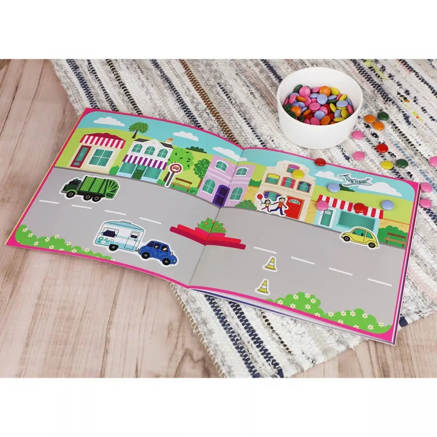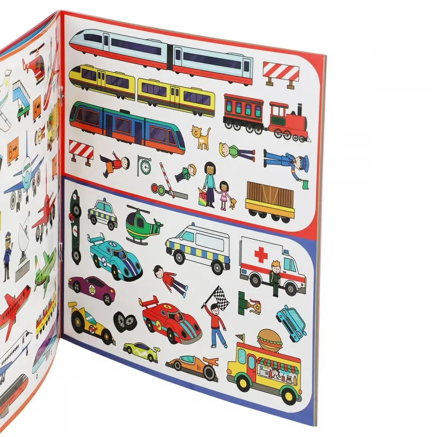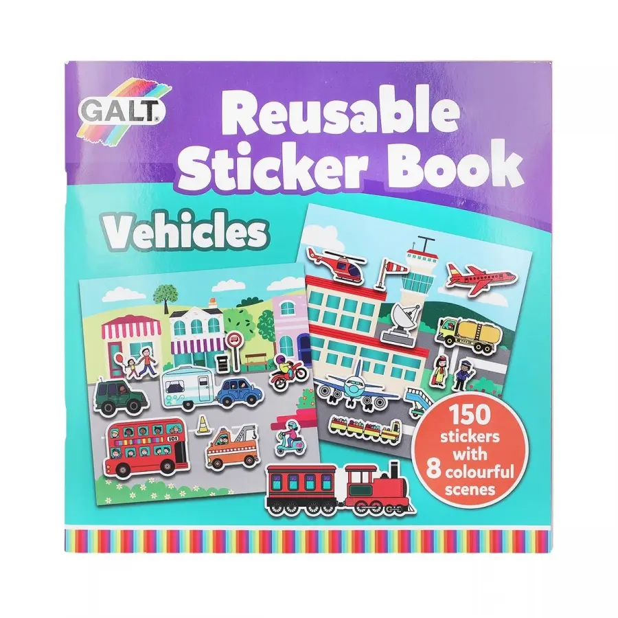 En stickerbok med fordon som tema. I boken finns det åtta färgglada landskap och 150 klistermärken som man kan använda om och om igen. Perfekt på resan!