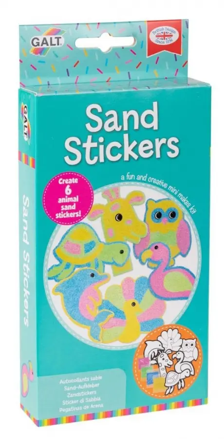Pyssla sex roliga sandstickers genom att klistra sand i fyra olika färger på stickersunderlag.