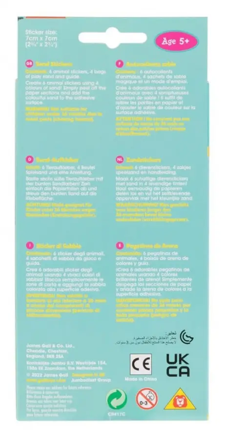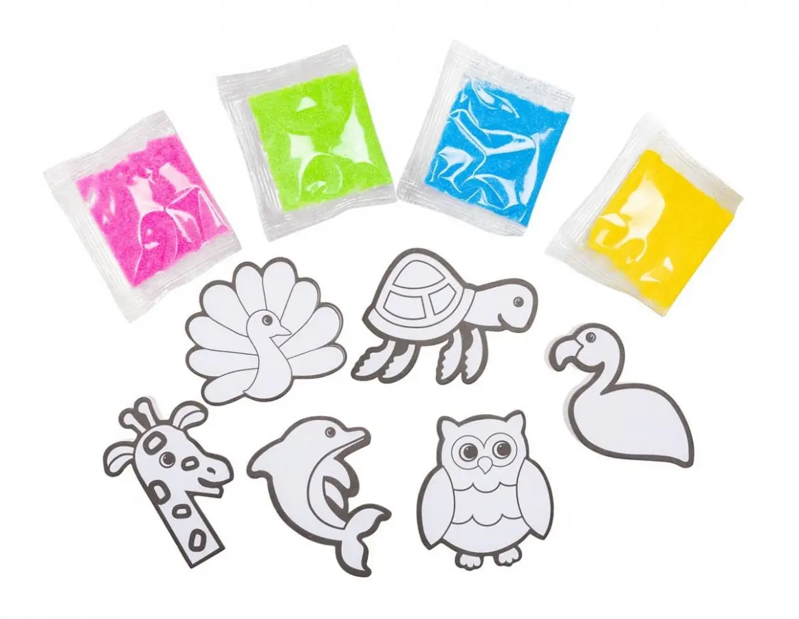 Innehåll: 6 djurstickers (dra av det skyddande pappret och häll den färgglada sanden på den klistriga ytan), 4 sandpåsar i olika färger och instruktionsguide.