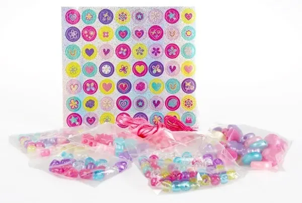 Innehåll: 25 "picture"-pärlor, 20 hjärtformade pärlor, 20 stjärnformade pärlor, 120 runda pärlor, 56 "holographic stickers", snöre, elastiskt snöre och en illustrerad instruktionsguide på svenska, finska och engelska.