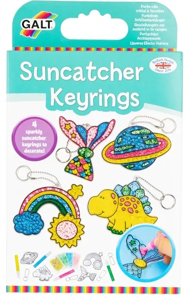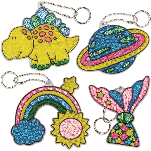 Pyssla och dekorera fyra glittrande, roliga solfångar-nyckelringar av formerna i plast. Måla nyckelringarna och dekorera dem med glänsande pärlor och paljetter.