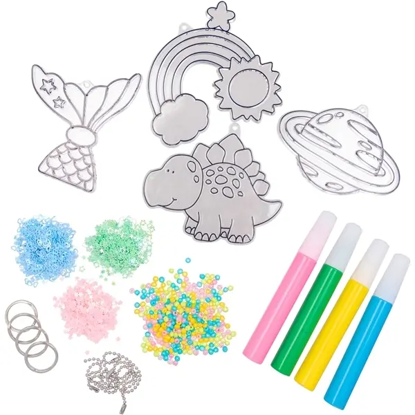 Innehåller: 4 solfångarformer i plast, 4 färgtuber, pärlor i flera färger, 3 påsar paljetter, 4 nyckelringar och illustrerade instruktioner.