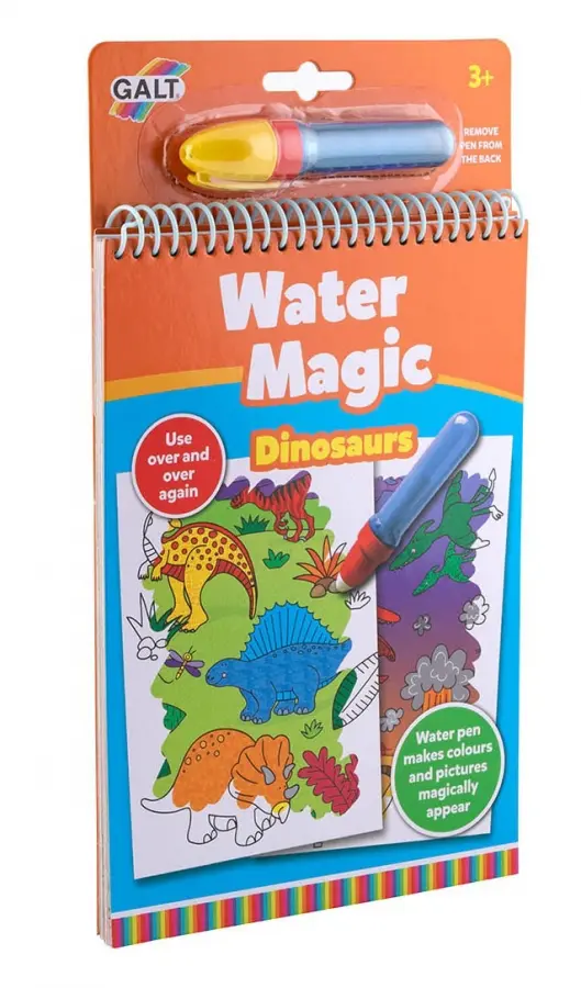 Fyll pennan med vatten och "måla" på någon av de sex målarbilderna i spiralblocket. Se hur färgglada motiv av olika dinosaurier i deras miljö träder fram på sidorna när du stryker över dem med vattnet. När vattnet torkat blir bilderna färglösa igen och det går att måla om och om igen. Perfekt på resan!
