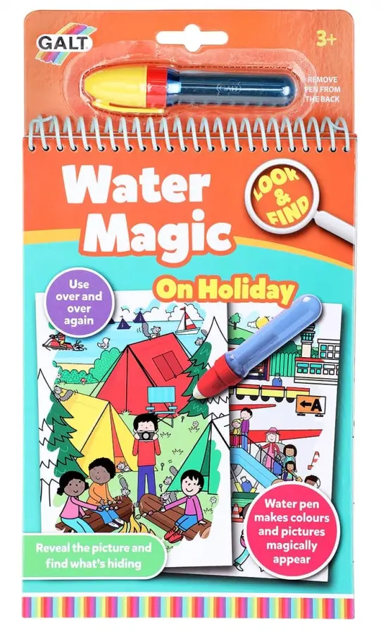 Fyll pennan med vatten och "måla" på någon av de sex målarbilderna i spiralblocket. Se hur färgglada semesterbilder träder fram på sidorna när du stryker över dem med vattnet. När vattnet torkat blir bilderna färglösa igen och det går att måla om och om igen. Perfekt på resan!