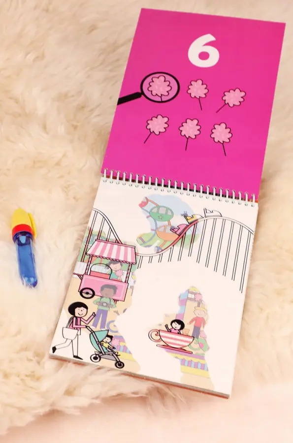 Den här vattenmålarboken har också ett "Leta och hitta"-tema. Till varje bild finns ett uppdrag, att hitta och räkna djuren och sakerna som gömmer sig i bilden.