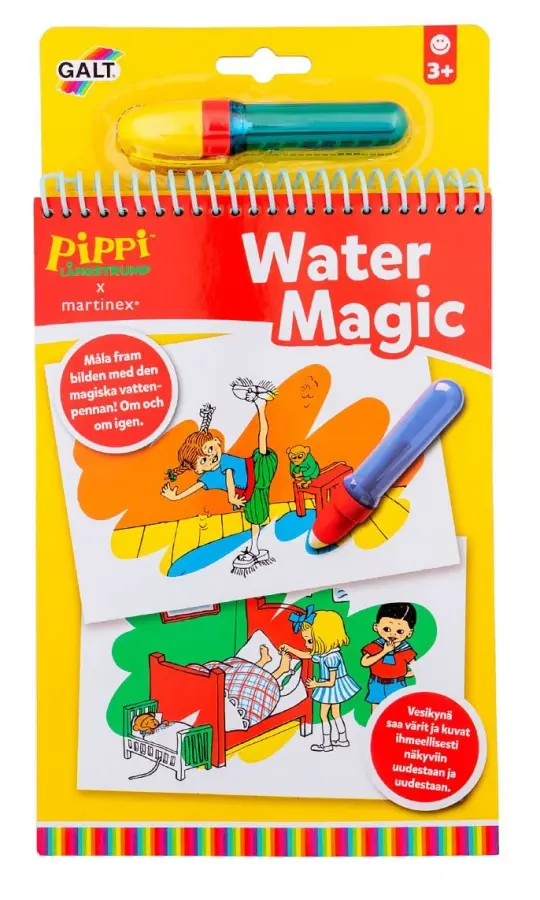 Fyll pennan med vatten och "måla" på någon av de sex målarbilderna i spiralblocket. Fina motiv och färger från Pippis spännande äventyr träder fram på sidorna när du stryker över dem med vattnet. När vattnet torkat blir bilderna färglösa igen och det går att måla om och om igen. Perfekt på resan!