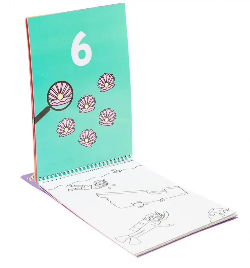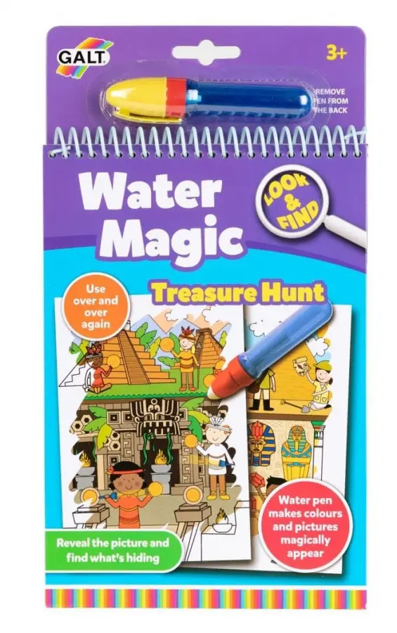 Fyll pennan med vatten och "måla" på någon av de sex målarbilderna i spiralblocket. Se hur färgglada skattjaktsmotiv träder fram på sidorna när du stryker över dem med vattnet. När vattnet torkat blir bilderna färglösa igen och det går att måla om och om igen. Perfekt på resan!