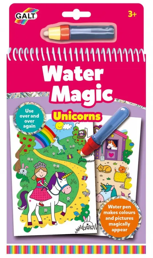 Fyll pennan med vatten och "måla" på någon av de sex målarbilderna i spiralblocket. Se hur färgglada motiv av enhörningar och prinsessor träder fram på sidorna när du stryker över dem med vattnet. När vattnet torkat blir bilderna färglösa igen och det går att måla om och om igen. Perfekt på resan!