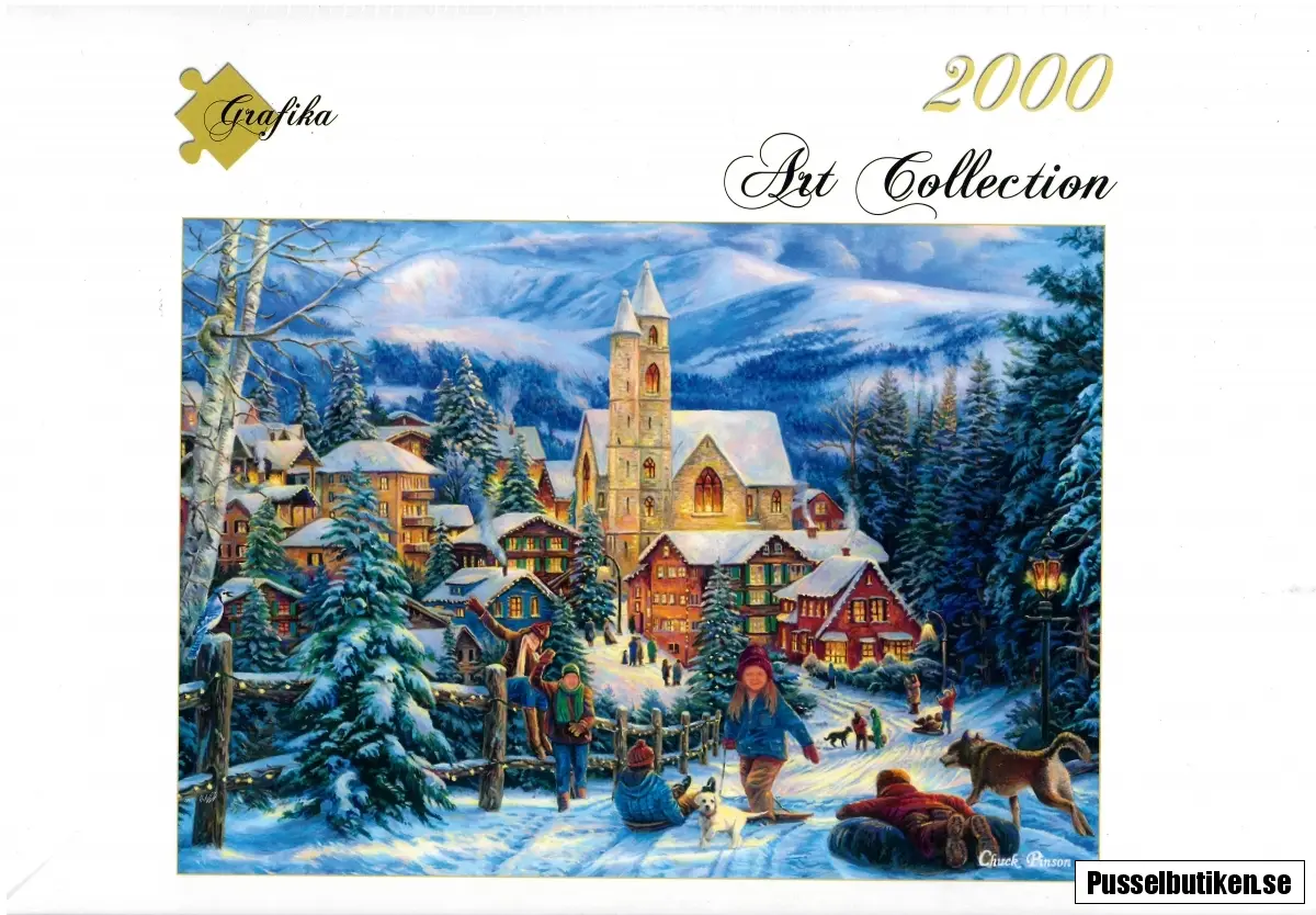 Idylliskt vintermotiv med barn som åker i backen ner mot den upplysta staden. Granarna är snöklädda och julbelysningen har satts upp. I bakgrunden syns de snöklädda bergen.