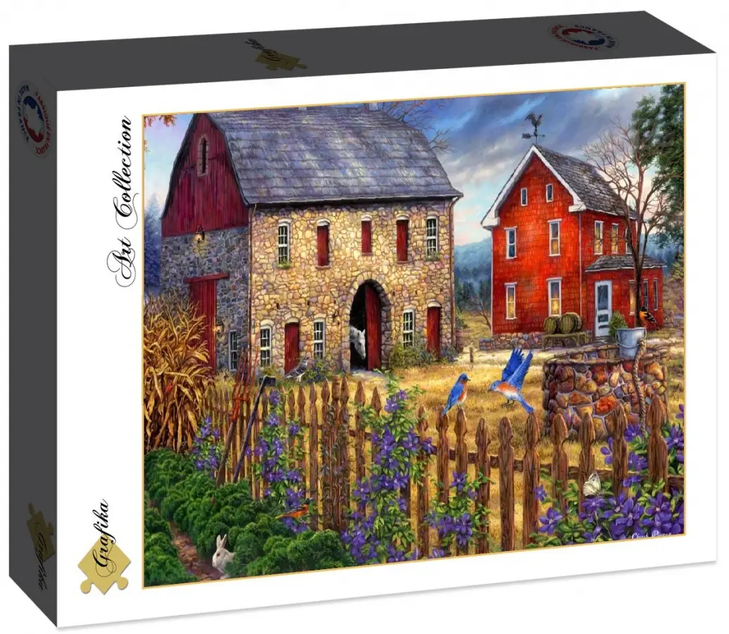 I det här pusselmotivet tar konstnären Chuck Pinson oss med till en gård på landet. Det är stilla i trädgården och en kanin har vågat sig ut för en munsbit i trädgårdslandet. På staketet slingrar sig blå Jackmanii och två blåsångare är på väg att slå sig till ro på grindstolparna. En vit häst tittar ut från ett stort stall och i den röda stugan lyser det inbjudande i fönstren.