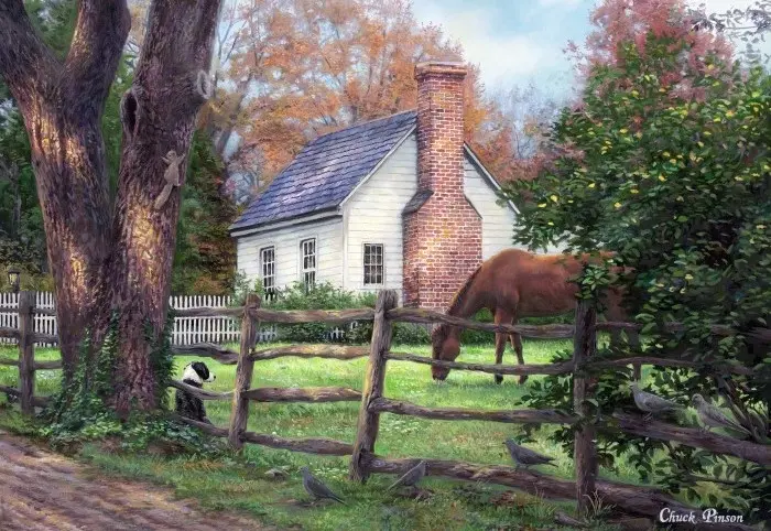 En häst står fridfullt och betar i lugn och ro i hagen intill huset. Bredvid det stora trädet vid hagens sida sitter en hund och tittar på. En långsam dag i en lantlig idyll där den sommaren sakta börjat övergå till höst.