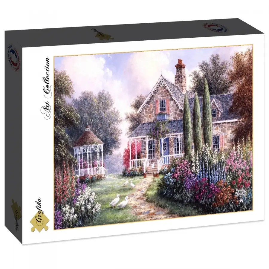 Romantisk och lantlig idyll med hus, lusthus och blommor. I trädgården syns finns fyra ankor och på trappen sitter en liten vit katt. Motivet är skapa av konstnären Dennis Lewan.