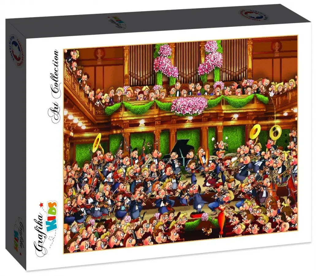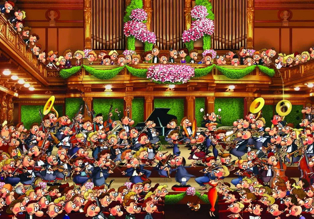 Det är dags för orkestern att spela upp. Gästerna är klädda till tänderna och salongen är smyckad med blommor. I bakgrunden tonar en mäktig orgel upp sig, men idag verkar det inte vara orkestern som får mest uppmärksamhet utan en oväntad och lite argsint besökare. Ett detaljrikt humormotiv av serietecknaren Francois Ruyer.