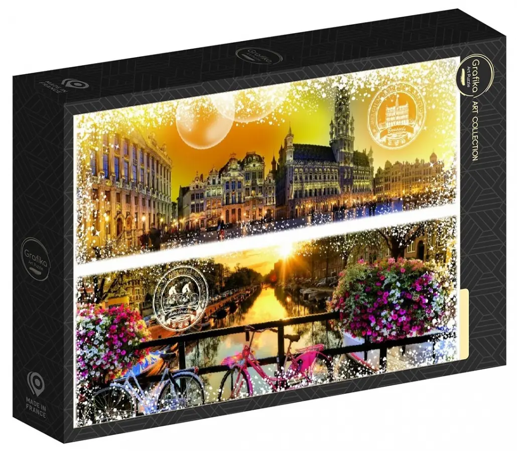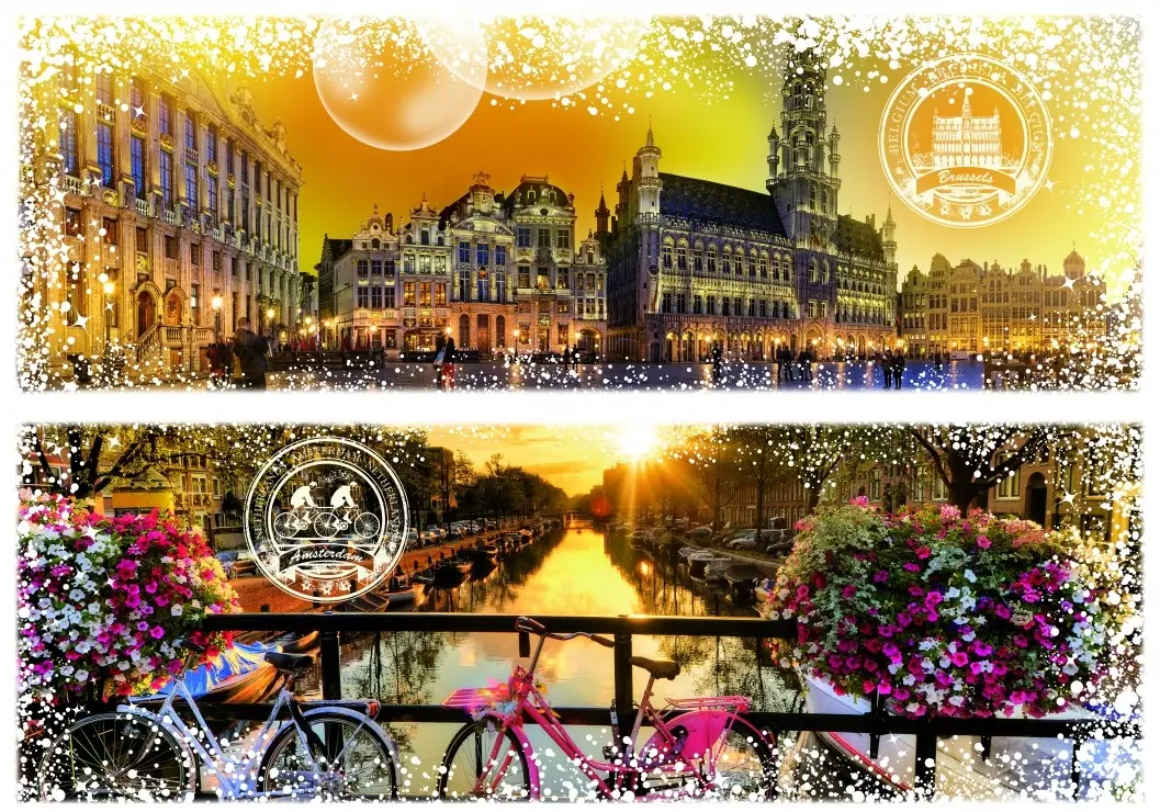 Två stadsmotiv i samma motiv! I det här pusslet får vi chans att lägga två olika städer i panoramavy, som omges av vita ramar med gnistor och bubblor. I det övre motivet ser vi ett foto från huvudstaden Bryssel i Belgien. I det undre ser vi en klassisk vy från Amsterdam, Nederländernas huvudstad.
