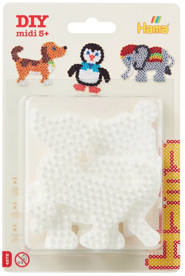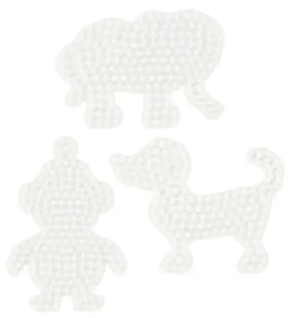 Ett set med tre pärlplattor med formerna av en hund, en pingvin och en elefant.