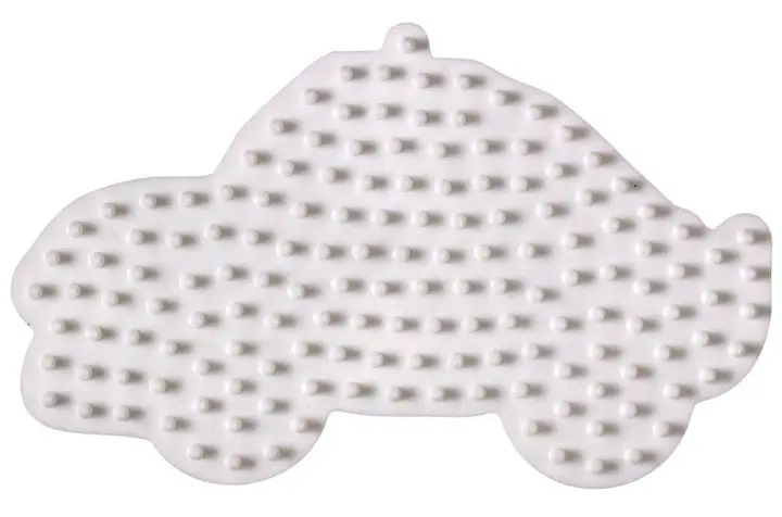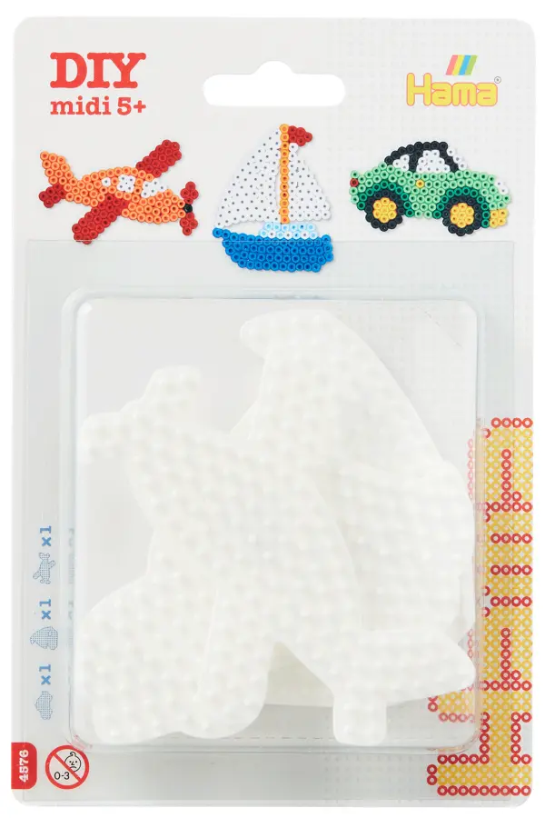 Ett set med tre pärlplattor med formerna av ett flygplan, en segelbåt och en bil.