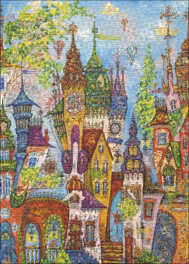 Följ med in i Tatyana Murovas sagolika by där färgstarka hus, snirkliga torn och flygande luftballonger skapar en magisk atmosfär. Ett lekfullt och detaljrikt pussel som bjuder på både utmaning och charm.