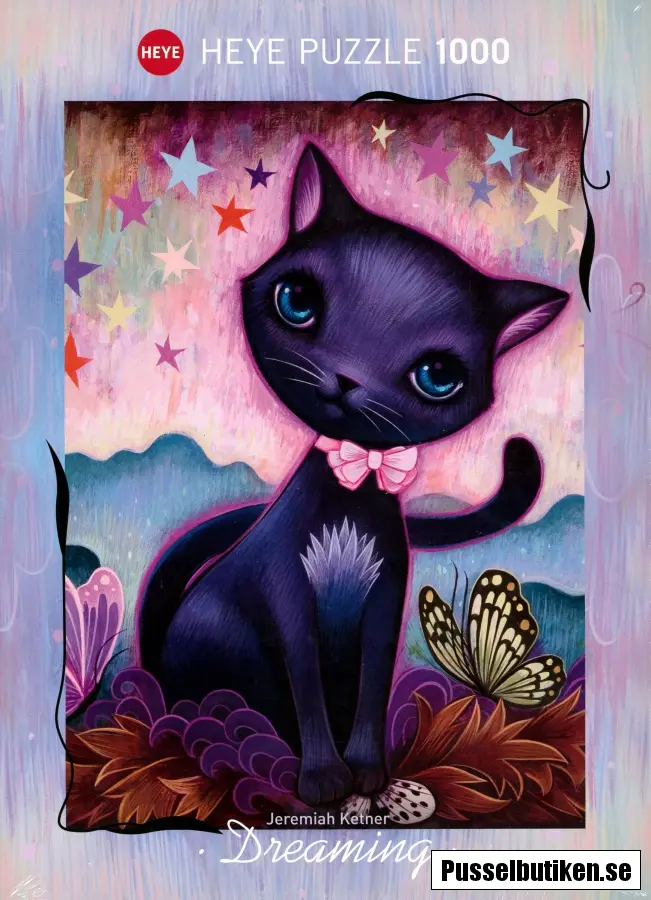En tecknad bild av en svart katt med stora blå ögon och en rosa rosett runt halsen. I bakgrunden syns en rosa himmel med stjärnor och kring kattens tassar flyger fjärilar.