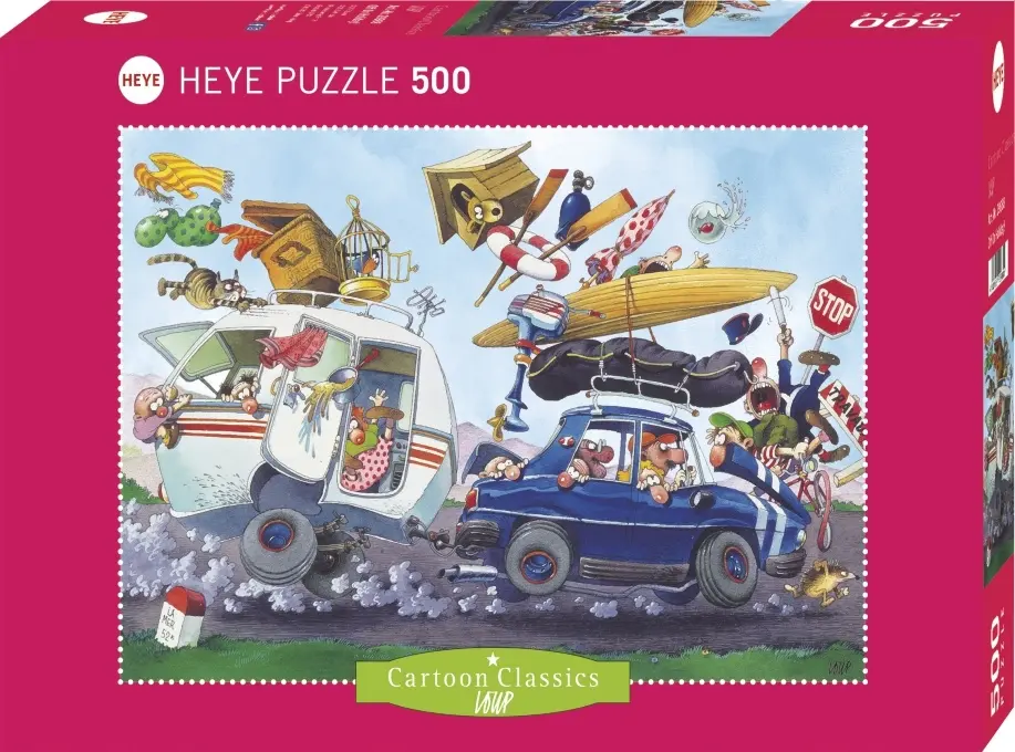 Längtan efter semester verkar vara större än någonsin i detta humormotiv av illustratören Jean-Jacques Loup. Bil och husvagn är fullpackad, men familjen verkar ha lite för bråttom och har tydligen missat stoppskylten.