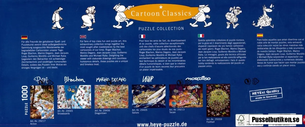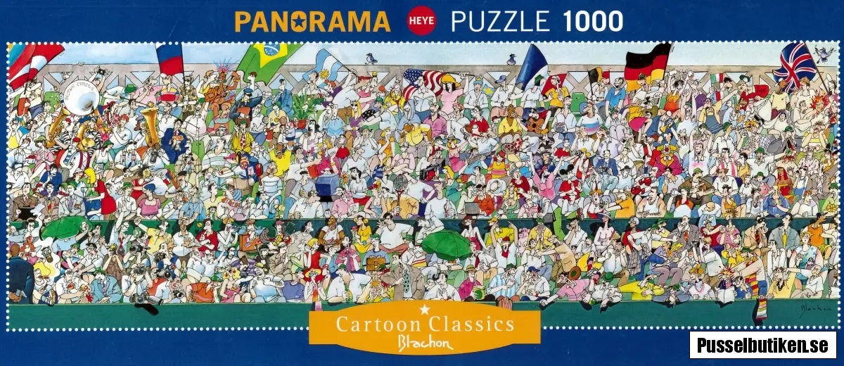 Panoramapussel med tecknat humoristiskt motiv av sportfans på en arena. Målat av serietecknaren Roger Blachon.