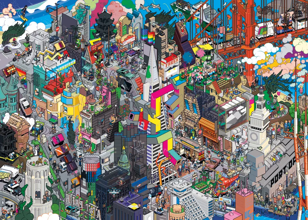 Upptäck San Francisco i eBoys ikoniska pixelstil! Detta färgstarka och detaljrika 1000-bitars pussel tar dig genom stadens välkända landmärken, branta gator och livliga kvarter – fullt av humor, små scener och dolda detaljer.