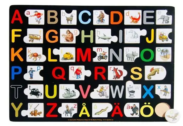 Lär dig alfabetet med hjälp av illustratören Jan Lööfs fina motiv. Greppvänliga bitar i trä!