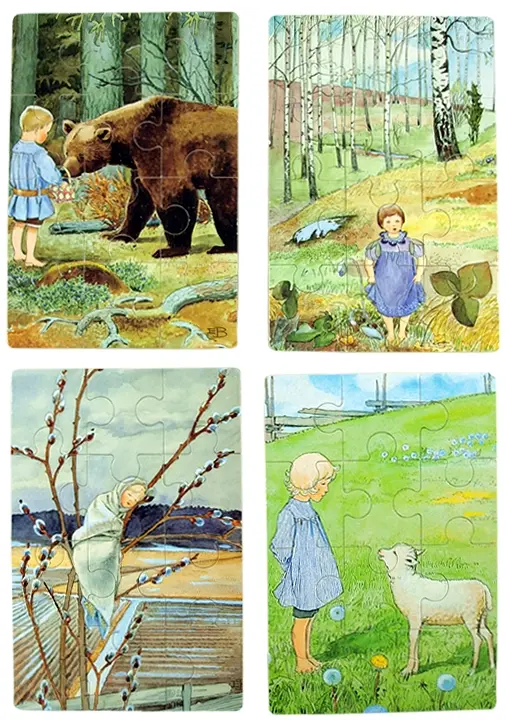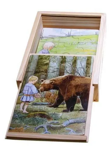 En fin trälåda som innehåller 4st träpussel på 12 bitar vardera, med motiv ur Elsa Beskows barnvisor ”Mors lilla Olle”, ”Videvisan”, ”Bä, bä, vita lamm” och ”Blåsippan”.