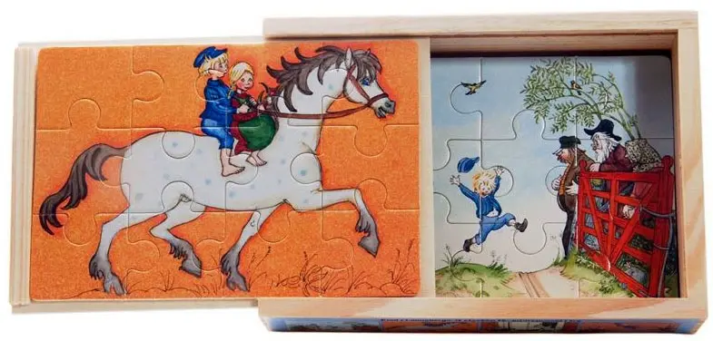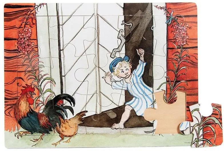 En fin trälåda som innehåller 4st träpussel på 12 bitar vardera, med motiv ur Astrid Lindgrens böcker om Emil i Lönneberga.